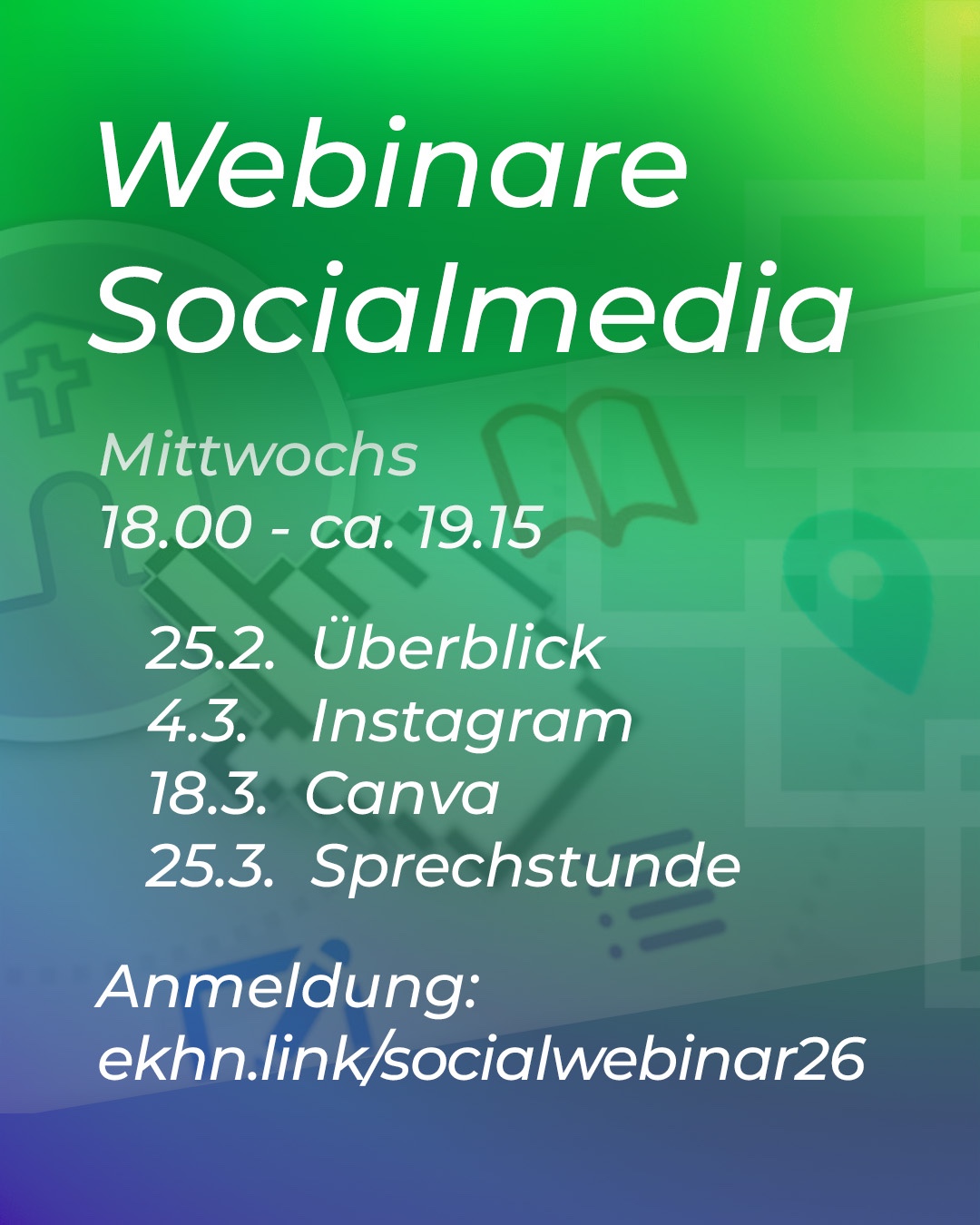 Eine neue Socialmedia-Webinarreihe startet am 25.2.. Jeweils Mittwoch 18.00 bis ca. 19.15 Uhr. Anmelden auch zu Einzelterminen über ekhn.link/socialwebinar26 — Teilnehmen können alle, egal woher sie kommen. — Info bitte weitergeben!